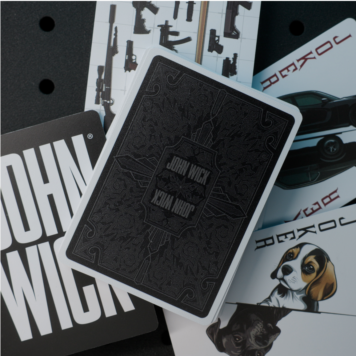 Two sanctioned PVC decks. Black on Black, Red on Black. Each case finished in Continental foil—a seal of distinction. Face cards feature iconic weapons inspired by the first film. The arsenal of Baba Yaga himself.