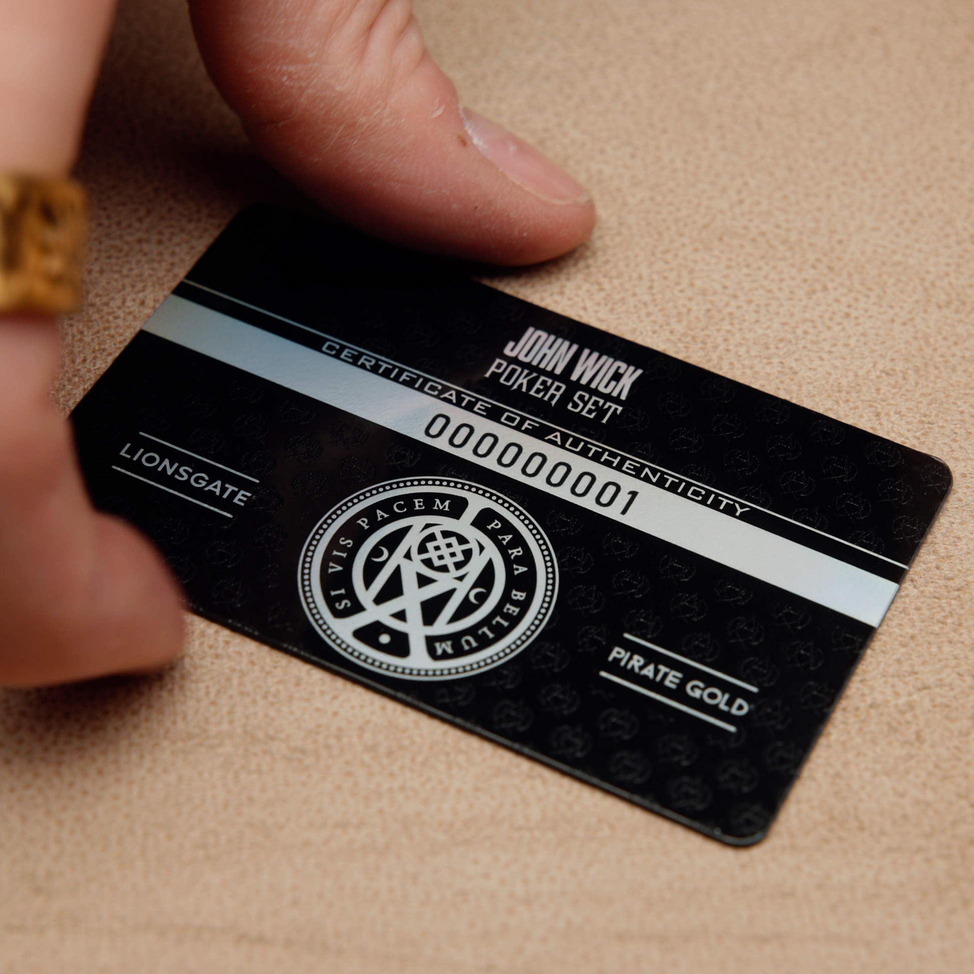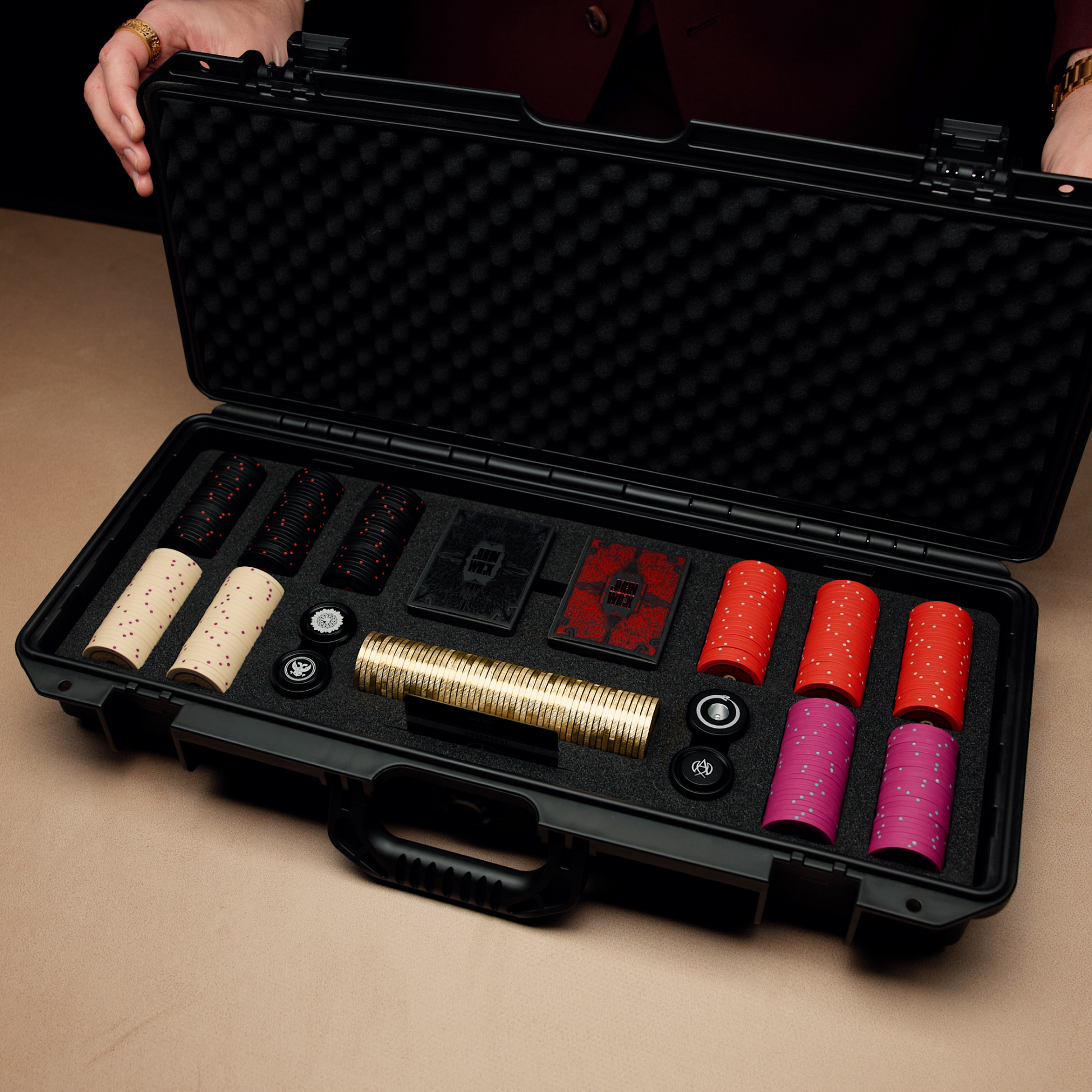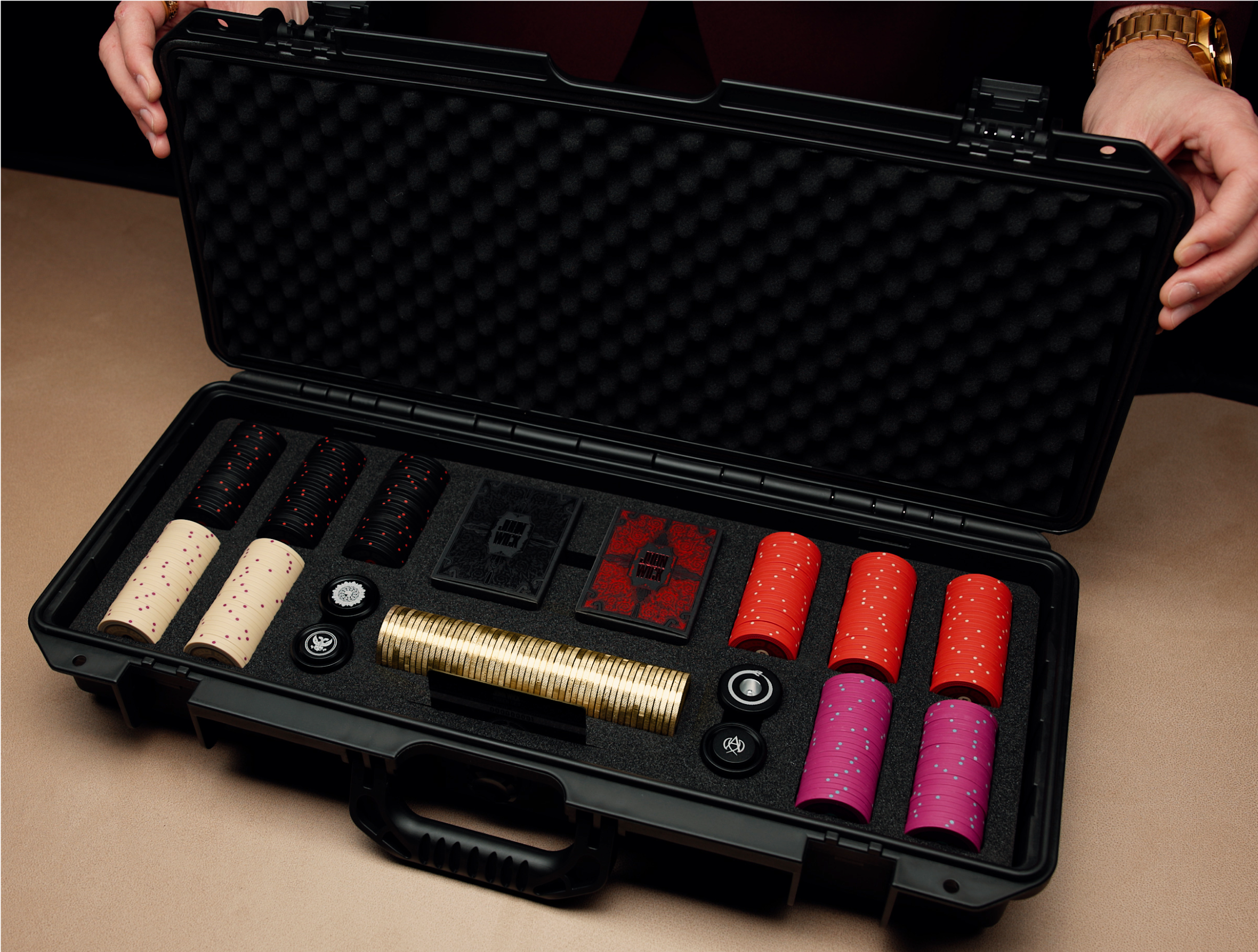 From the world of JOHN WICK: the official collector's poker set. Forged to The High Table's standards, this ensemble holds the sanctioned currency and implements of legend: 50 solid-metal Continental Gold Coins, 250 Clay Chips weighted with DeadDrop© precision, and a four-piece Signature Dealer Stack that locks together as a single totem. Two Collector's Decks bear the iconic weapons inspired by the first film, and a serialized Certificate of Authenticity secures provenance. Every article rests within an armored case—sanctioned, sealed, and ready for those who understand the weight of consequence.