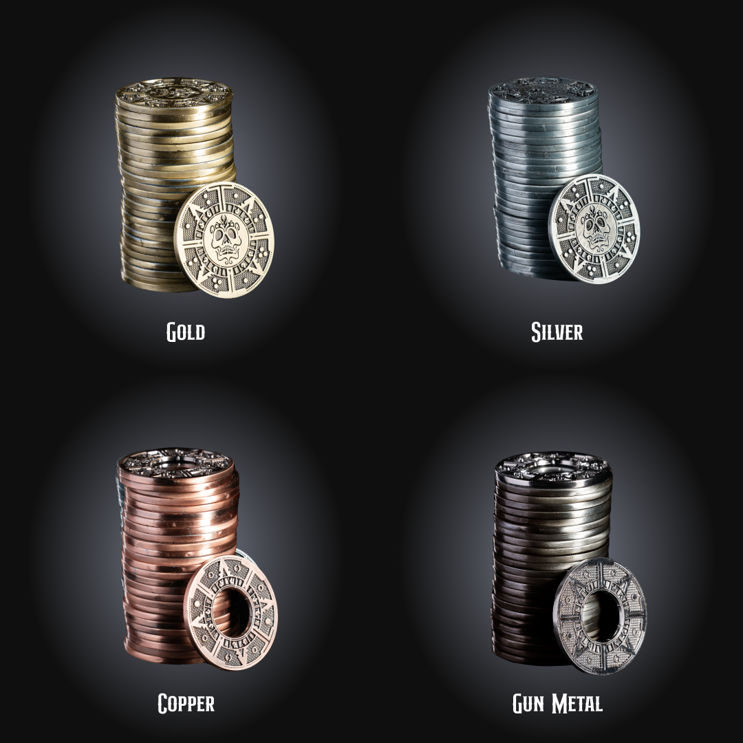 300 Metal Coins – Available in four finishes: gold, silver, copper, and gunmetal. Each finish brings authenticity to your gameplay, adding weight and realism to every round.