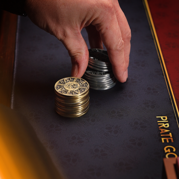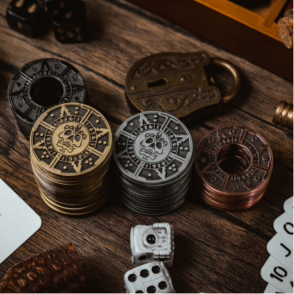 Pirate Gold chips are crafted from durable metal, offering more weight and longevity than standard clay or plastic chips. The unique pirate-themed design and detailed craftsmanship elevate the gaming experience, making this set a premium, immersive option for poker enthusiasts.