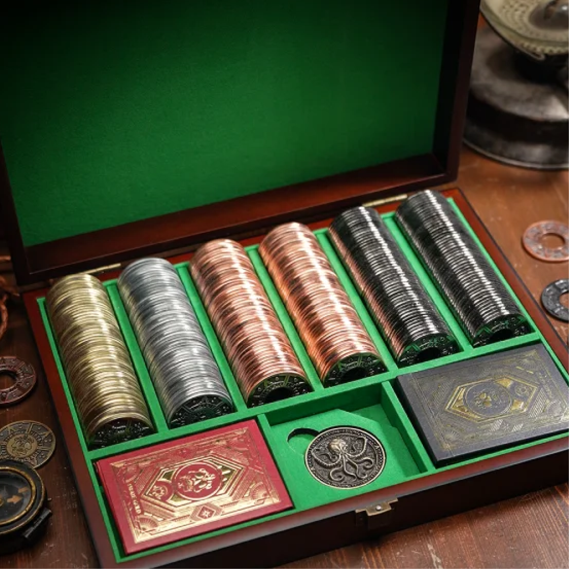 Good weight and size, I can’t wait to see my players reactions when I show them I got the full poker set with the etxraloot bonus 60 coins. I’m planning to get the fidget coin too since theirs a spot for it in this beautiful case. I love the travel case the wood box comes in too!